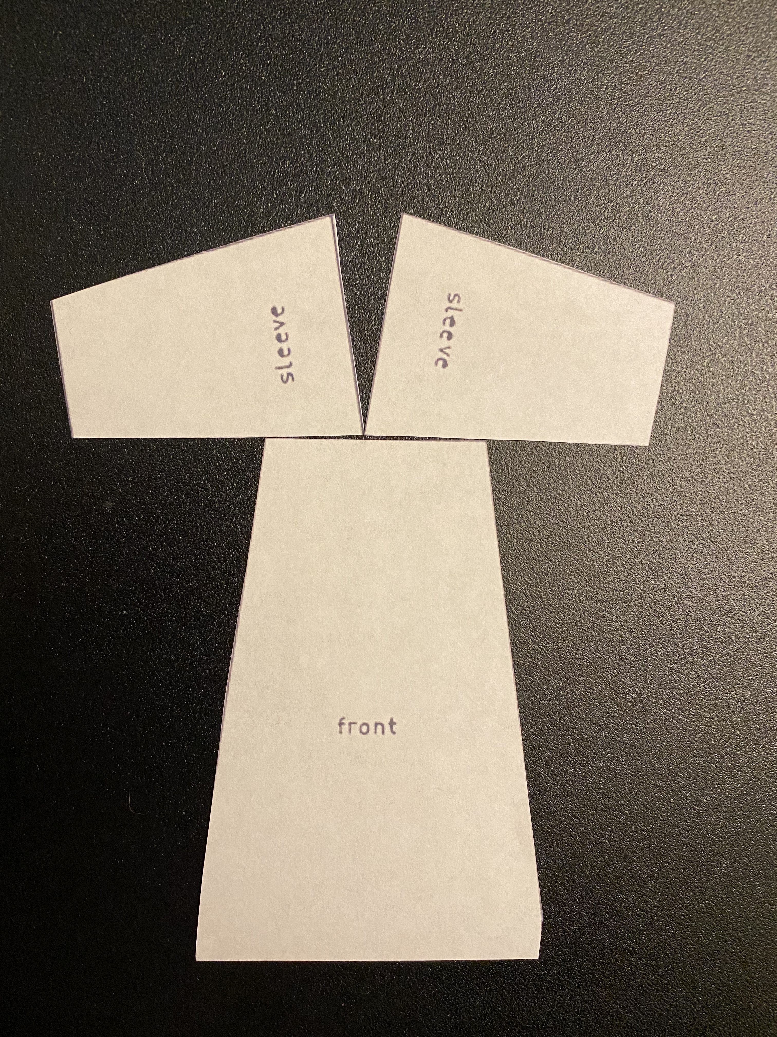 Here is a view of how it all goes together. You turn the sleeve 90o to the cutting layout for construction and the angle of the sleeve cut creates the V-neck.