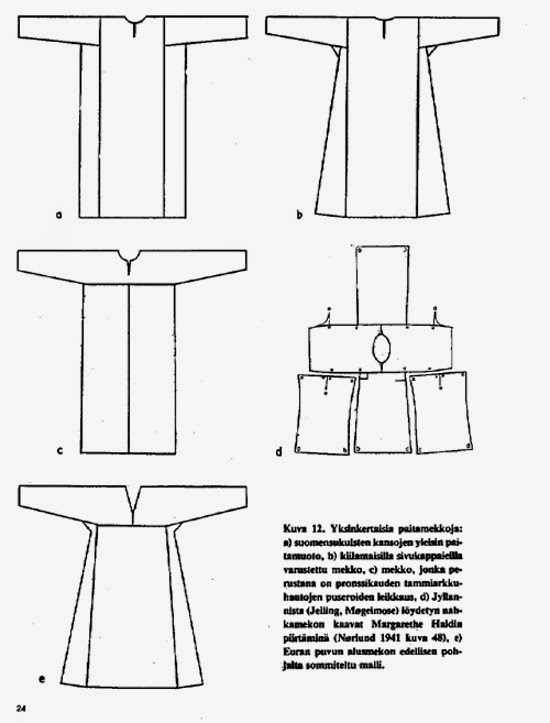 A long and loose garment extending to the ground and often with long narrow sleeves was common in both Western European and Byzantine dress during the Iron Age. In addition to the small extant fabric fragments found in Finland, a leather tunic found in a Danish bog provides more insight into the likely shape of the under garment. The leather bog tunic has sleeves that cover from the wrist to the neck so that there are no shoulder seams, and the body is formed of a front, a back, and two side pieces.