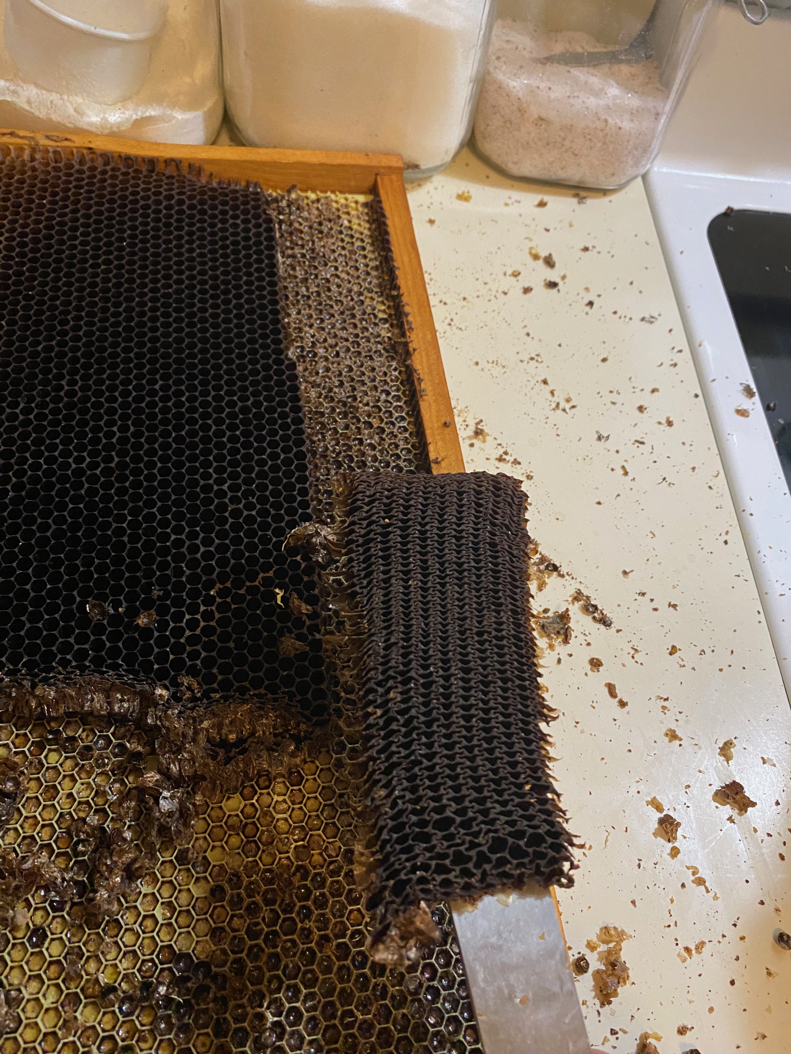 There was no honey in my frames but in a hope to get some wax I scraped the frames and cooked down the comb to extract the wax. This process was surprisingly easy as it really is just putting the comb and enough water to cover it into a double boiler. Also, my house smelled amazing! Once it is thoroughly melted and mushy strain the liquid through a fine cloth.