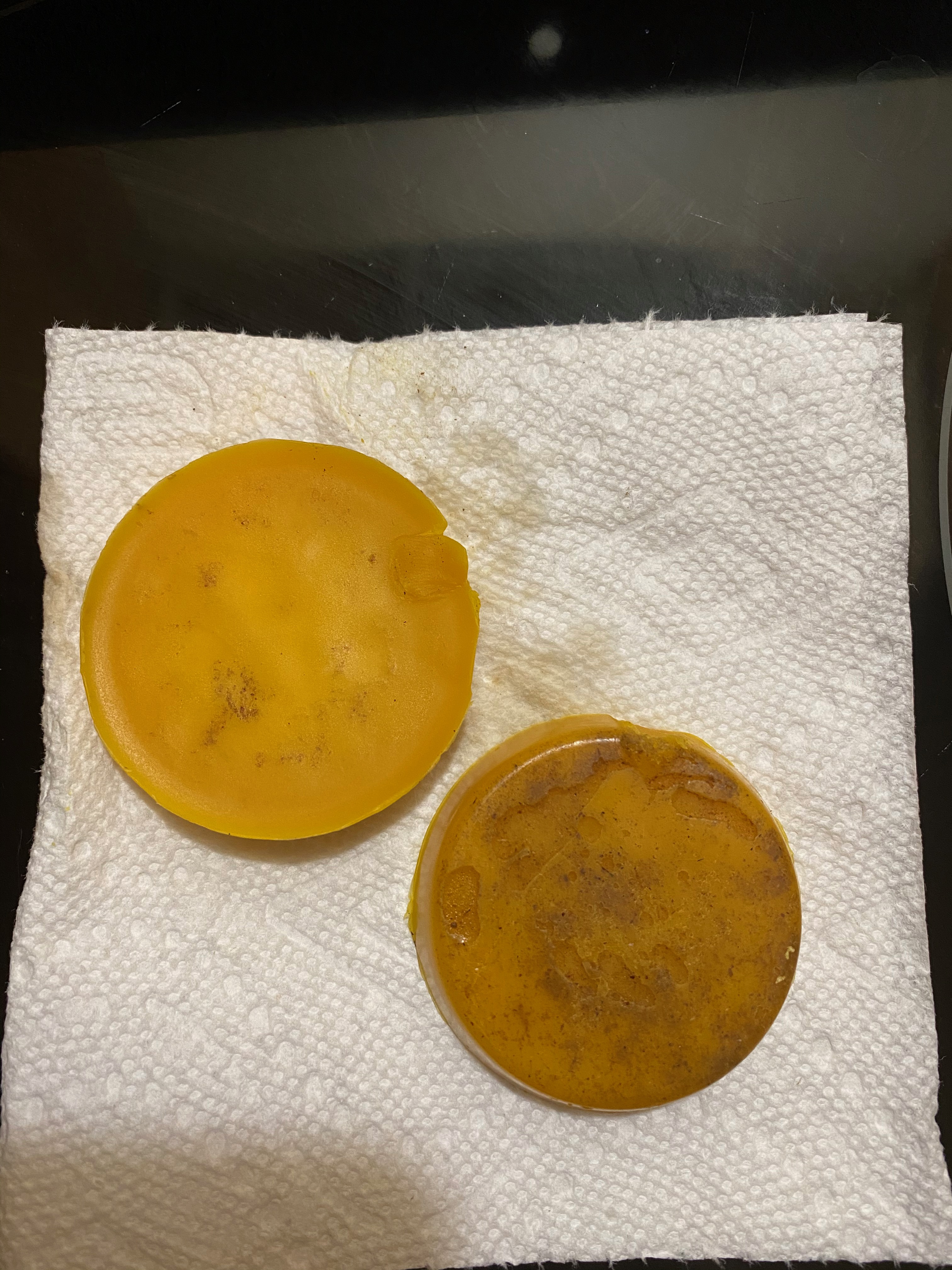 I then broke up the wax and put it into a muffin tin in my oven at 150o F to make smaller disks.